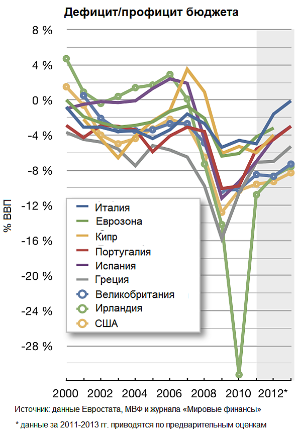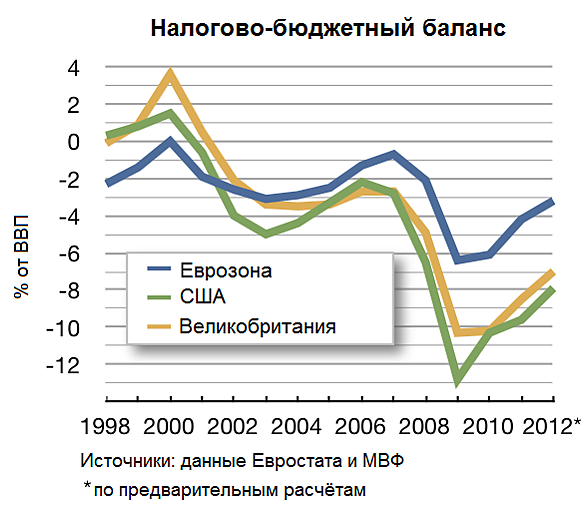В 2013 году совокупный дефицит бюджета 17 стран еврозоны опустился до 2,9 % ВВП с 3,6 % ВВП в 2012 году — впервые с 2008 года бюджетный дефицит стран еврозоны упал ниже таргетируемого уровня в 3 % ВВП[40]. Госдолг стран еврозоны в конце 2013 года составил рекордные 90,9 % ВВП (9,008 трлн евро) по сравнению с 89 % в конце 2012 года[40].