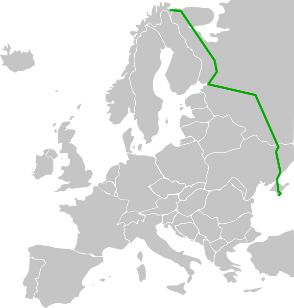 Основные пункты маршрута: Киркенес — Эльвенес — Мурманск — Кандалакша — Беломорск — Петрозаводск — Санкт-Петербург — Тверь — Москва — Тула — Орёл — Курск — Белгород — Харьков — Запорожье — Симферополь — Алушта — Ялта.