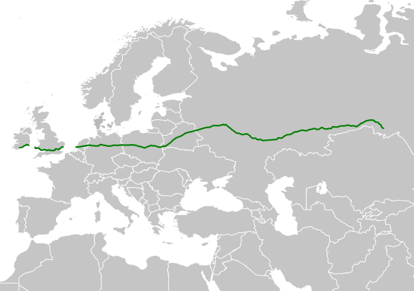 Основные пункты маршрута: Корк — Уэксфорд — Суонси — Кардифф — Ньюпорт — Бристоль — Лондон — Гаага — Утрехт — Амерсфорт — Хенгело — Оснабрюк — Мелле — Ганновер — Магдебург — Берлин — Франкфурт-на-Одере — Познань — Варшава — Бяла-Подляска — Тересполь — Брест — Кобрин — Берёза — Барановичи — Минск — Борисов — Орша — Смоленск — Москва — Рязань — Пенза — Сызрань — Жигулёвск — Тольятти — Уфа — Миасс — Челябинск — Курган — Ишим — Омск.
