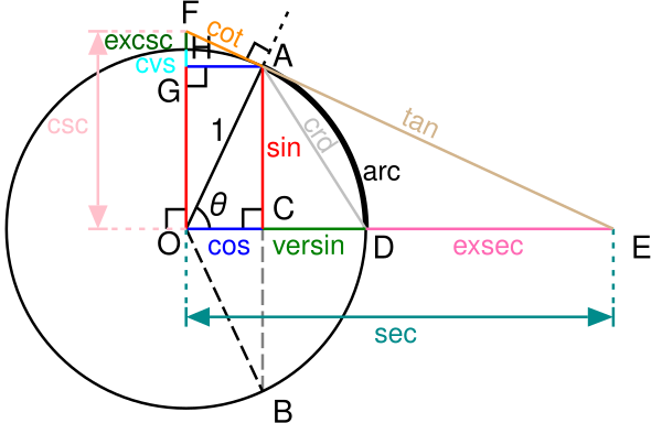 Синус и косинус могут быть описаны следующим образом: если соединить любую точку на единичной окружности с началом координат , получается отрезок, находящийся под углом относительно положительной полуоси абсцисс. Тогда получим[2]: