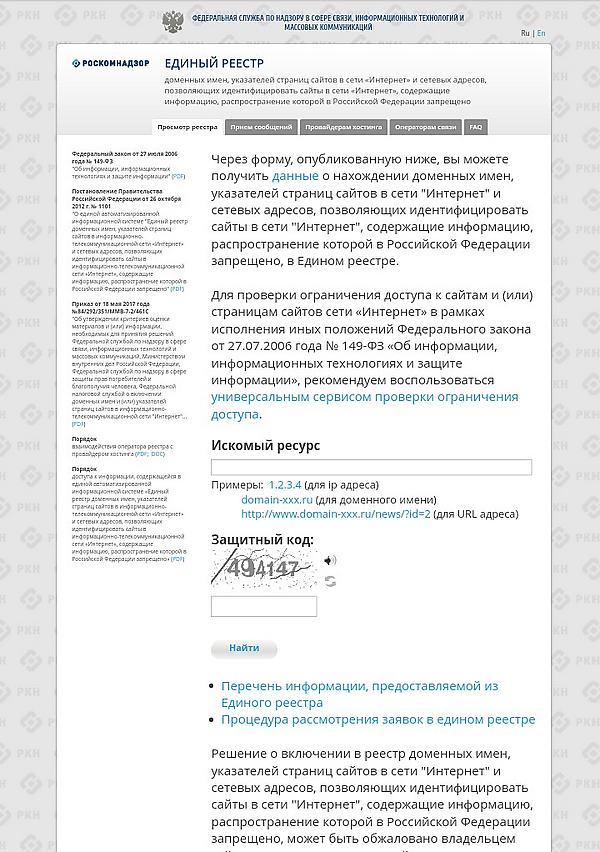 Доступ к реестру организован с помощью сайта eais.rkn.gov.ru, который, однако, не предоставляет обычным пользователям возможности посмотреть весь реестр или его часть, он обеспечивает только: