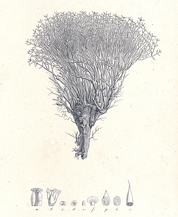 Полукустарничек высотой 5—10 (до 15) см, голый, с плотной дерновинкой; с многочисленными, густо собранными, почти цилиндрическими, ломкими, простыми или ветвистыми, светло-зелёными стеблями этого года.