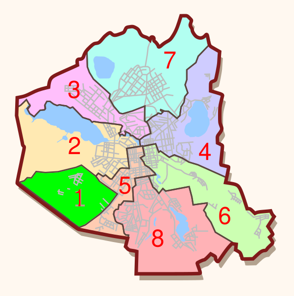 Город и округ подразделяются на 8 внутригородских районов[44][45]:
