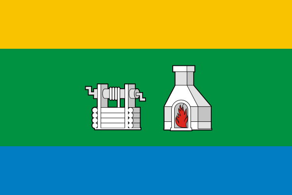 Флаг наравне с гербом является официальным символом Екатеринбурга. Символика флага воспроизводит символику герба Екатеринбурга. Представляет собой полотнище с соотношением ширины к длине 2:3, составленное тремя горизонтальными полосами жёлтого, изумрудно-зелёного и синего цветов, имеющими ширину 1/4, 1/2, 1/4 соответственно. По центру зелёной полосы помещено изображение фигур герба Екатеринбурга (рудокопная шахта в виде колодезного сруба с воротом о двух рукоятках и плавильная печь с красным огнём внутри), выполненное белым цветом. Оборотная сторона полотнища зеркально воспроизводит лицевую сторону[57].