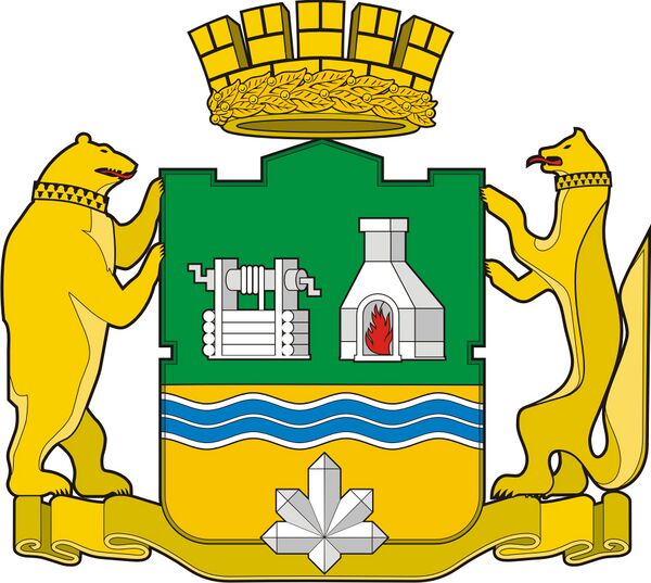 Герб Екатеринбурга был принят решением Екатеринбургской городской думы № 43/1 от 23 июля 1998 года[54]. Щит герба разделён на две половины — изумрудно-зелёную (исторический территориальный цвет Урала) и золотую. Разделение на два цвета указывает на границу между Европой и Азией. Верхняя (зелёная) часть щита напоминает крепость, которой Екатеринбург являлся в первые годы существования города, на ней изображены рудокопная шахта в виде колодезного сруба с воротом о двух рукоятях и плавильная печь с красным огнём — эти символы появились на гербе Екатеринбурга в 1783 году. Они символизируют горнодобывающую и металлургическую отрасли промышленности Урала. Волнообразный синий пояс символизирует реку Исеть. Фигуры щитодержателей — медведь, символизирующий европейскую часть России, и соболь, символизирующий Сибирь, — изображены с высунутыми языками и оскаленными зубами, потому что они охраняют город. Золотая лента в нижней части герба является признаком столичности Екатеринбурга — одного из крупнейших административных центров России. В середине она украшена кристаллом друзы, символизирующей минеральные богатства Урала[55]. 23 мая 2008 года в герб был внесён новый элемент — статусная корона в виде крепостной башни с пятью зубцами[56].