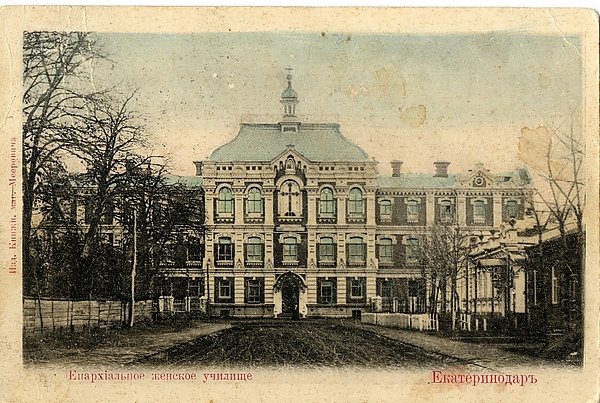 Здание бывшего Епархиального женского училища (ныне КубГМУ) является памятником гражданской архитектуры конца XIX — начала XX в., имеет статус объекта культурного наследия. Епархиальное женское училище возведено выдающимся архитектором И. К. Мальгербом по проекту другого талантливого зодчего В. А. Филиппова в 1901 г. В построении архитектурных форм его отличает ясное и чёткое членение фасада по центральной оси, симметричное расположение всех архитектурных элементов, слагающих фасад здания в стиле эклектизма. Особую нарядность зданию придают богато украшенные наличники окон и витраж в форме православного креста в центральной выступающей части строения (в пролёте парадной лестницы).