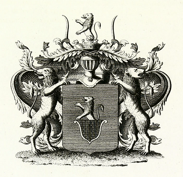 Описание герба: Выдержка из Общего гербовника В щите, имеющем голубое поле, каменная стена красного цвета, из которой выходит золотой лев. Щит увенчан обыкновенным дворянским шлемом с дворянской на нём короной, на поверхности которой видны два золотых рога, между которыми обозначенный в щите лев. Намёт на щите голубой, подложен золотом. Щит держат два льва. |