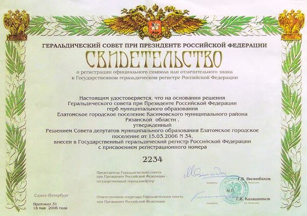 Современный герб Елатьмы был утверждён[88] и подтверждён[89][90] решениями Совета депутатов МО ЕГП. Герб Елатьмы внесён в Государственный геральдический регистр РФ под № 2234[91].