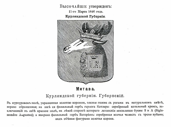 В 1573 году, с выдачей Митаве прав города герцогом Готхардом Кетлером, был предоставлен и герб — голова коронованного лося на красном фоне. Современный малый герб города утверждён решением Государственной комиссии по геральдике 11 июля 2002 года: на пурпурном фоне — голова лося природного цвета, на его шее — малый государственный герб Латвии (без звёзд)[14]. Рисунок городского герба положен также в основу флага города.