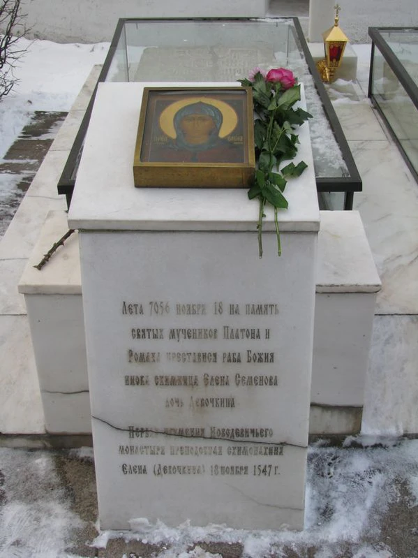Елена скончалась 18 ноября 1547 года и была погребена у северной стены алтаря Смоленского собора монастыря. Рядом с ней позднее погребли монахиню Феофанию (вероятно, одна из 18 сестер, прибывших с Еленой в Москву из Суздаля). В конце XVII века над их могилами возвели часовню, которая перестраивалась в 1720—1722 годы. В первой половине XIX века в стену собора поместили памятную плиту, сохранившуюся по настоящее время. В 1920—1930-х годах в ходе перепланировки монастырского кладбища часовня была разобрана и в настоящее время могильная плита указывает лишь приблизительное место захоронения Елены.
