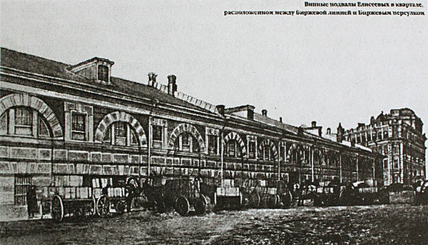 Фирменные напитки — херес и мадера являлись предметом особой гордости торгового дома. Елисеевский винный подвал на Васильевском острове общей протяженностью более километра являлся достопримечательностью Петербурга. Огромное впечатление на посетителей производили «целые ряды больших бочек, ёмкость которых доходила до 700 ведер». Аналогов таких «подземных предприятий» в Российской империи не было. Строительство винных подвалов было начато в 1862 году. Винные подвалы представляли собой одноэтажное монументальное каменное сооружение, главный фасад которого выходил на Биржевую линию. Строительство подвалов, как и многих других зданий, принадлежавших Елисеевым, осуществил архитектор Н. П. Гребёнка.