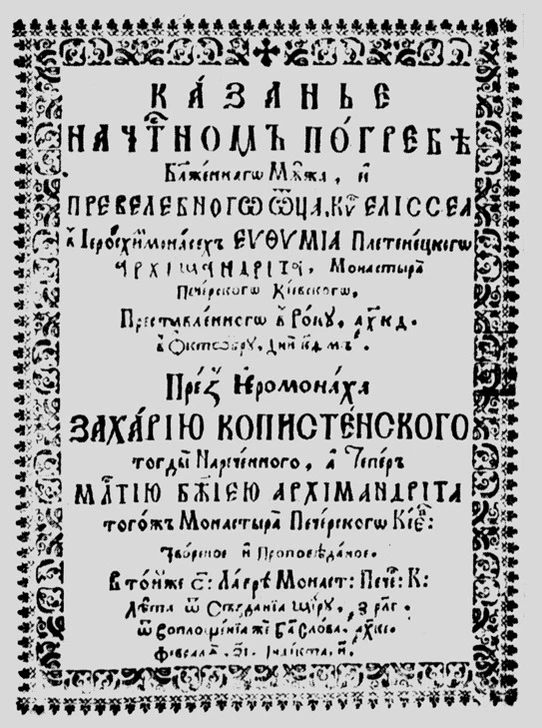 - Копистенський З. «Казанье на честном погребі Еліссеа в ієросхимомонасех Евфиміа Плетенецкого». – Київ, друкарня Києво-Печерської лаври. – 1625.