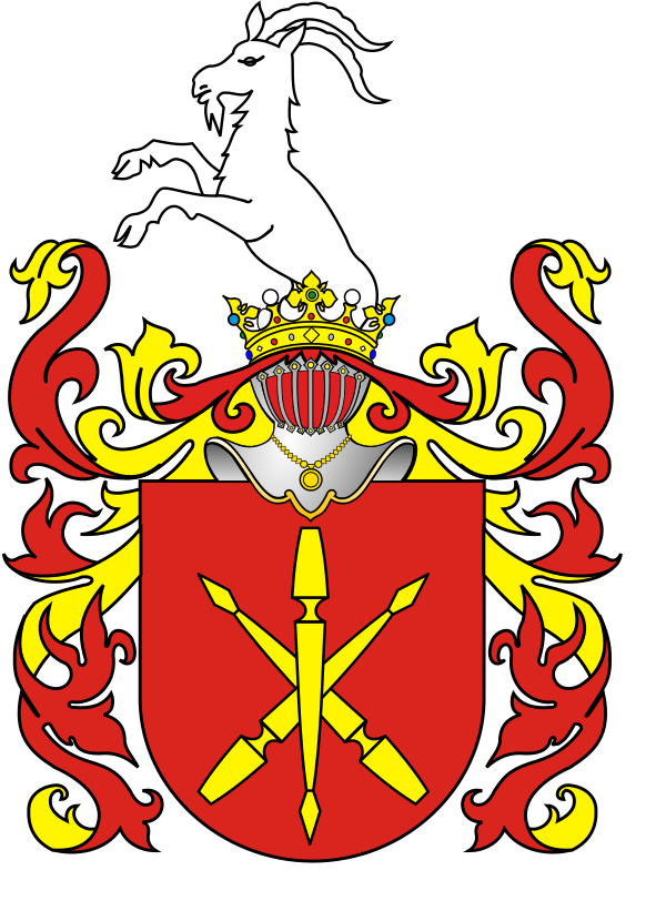 В поле червлёном три копья золотых, перекрещенных в виде звезды, среднее острием вниз, а боковые вверх. В нашлемнике — вырастающий до половины козел, обращенный вправо.