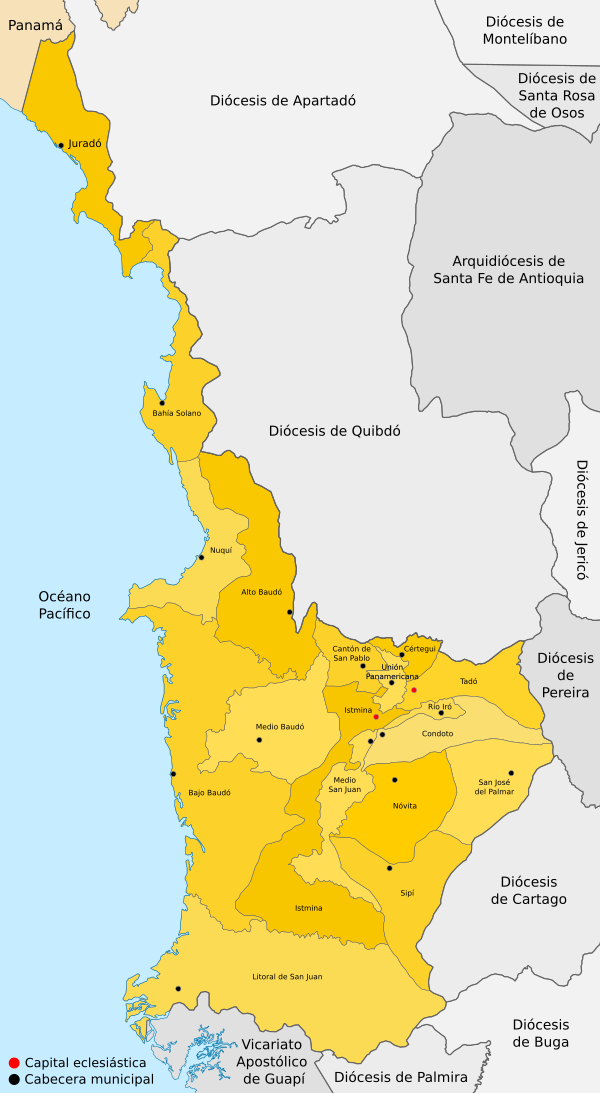30 апреля 1990 года Римский папа Иоанн Павел II выпустил буллу «Quamvis nonnullis», которой преобразовал апостольский викариат Истмины в епархию Истмины-Тадо. В этот же день епархия Истмины-Тадо вошла в митрополию Санта-Фе-де-Антиокии.