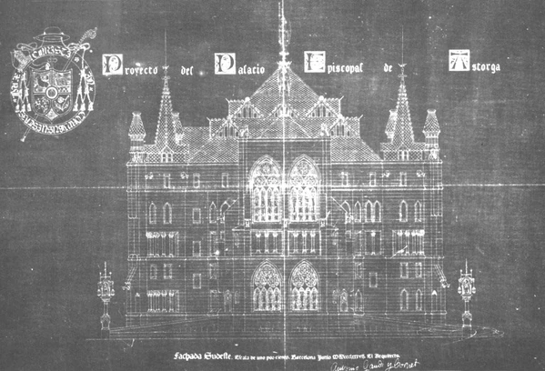 Созданию дворца послужил пожар (1886 год), уничтоживший прежнюю резиденцию епископа, который попросил своего знакомого мастера — Гауди — построить ему новую резиденцию. Именно в этот период Гауди был занят дворцом Гуэля, павильонами Гуэля, колледжем Дэ Лас Тересианас и Саграда Фамилией, потому и не мог приехать в Асторгу. Проект дворца был подготовлен на основе фотографий участка[2].