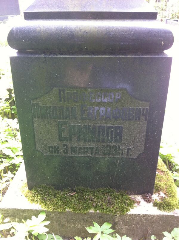 Проф. Н. Е. Ермилов прожил долгую жизнь, он умер в 1935 году в возрасте 77 лет. Запись о его захоронении имеется в книге «Кладбища Петербурга» в списке «Исторические захоронения на Смоленском православном кладбище С-Пб». На могиле Н. Е. Ермилова (участок 105) установлен чугунный ажурный крест на гранитном постаменте.