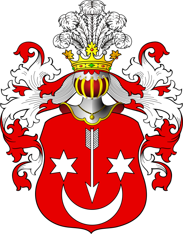Опрокинутая стрела, сопровождаемая с боков двумя звёздами и снизу полумесяцем.
