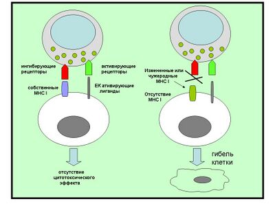 Большинство NK-клеток экспрессируют ингибирующие рецепторы, которые распознают молекулы MHC-I, присутствующие на поверхности всех нормальных здоровых клеток, имеющих ядро. Чаще всего клетки, инфицированные вирусами или внутриклеточными патогенами, перестают экспрессировать MHC-I. Рецепторы NK-клеток, распознающие MHC-I, фундаментально отличаются от T-клеточных рецепторов, взаимодействующих с MHC-I. Самые многочисленные ингибирующие рецепторы NK-клеток относятся к группе KIRs и распознают широкий спектр молекул MHC I класса. Многие ингибирующие рецепторы являются лектинами (например, гетеродимерный рецептор CD94/NKG2A). Третьим по многочисленности семейством ингибирующих рецепторов NK-клеток является LIRs (от англ. leucocyte immunoglobulin-like receptors). Эти рецепторы, как и KIRs, имеют иммуноглобулиновый домен и связываются с молекулами MHC-I, но с меньшим сродством, чем KIRs. LIRs больше экспрессируются B-клетками, чем NK-клетками[18].