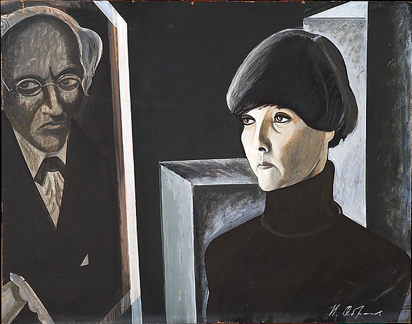 На переднем плане справа на фоне объемов серого цвета, выполненных в стиле геометрического абстракционизма, изображена в 3/4 повороте влево молодая женщина с короткими чёрными волосами и густой чёлкой, закрывающей лоб. Её черты лица имеют восточный тип, взгляд направлен вперёд. Женщина одета в чёрный свитер с высоким воротником. Слева представлен погрудный портрет Фёдора Тютчева. Моделью для женского образа послужила Белла Ахмадулина.