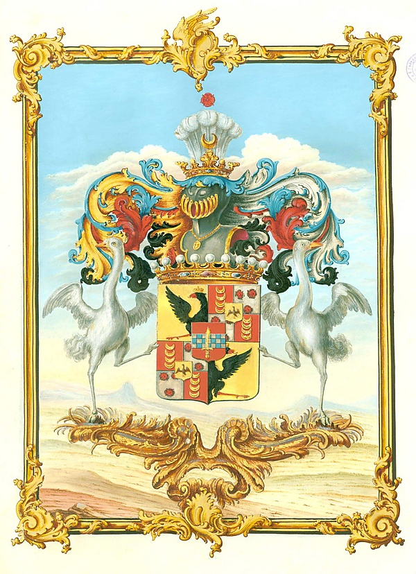 Вторая и третья части разрезанные начетверо, составляют крестообразно красное и серебряное поля, с изображением в красном поле по четыре одна над другою золотые луны рогами вверх, а на серебре по три красного цвета розы; посредине же сих двух частей в золотом щитке находится по одному жаворонку.