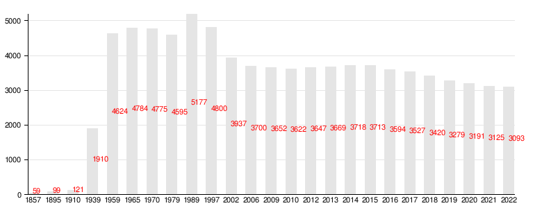 Изменение численности населения за период с 1857 по 2022 год[40][41][42][43][44][45][46][47][48][49]: