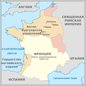 В 1420 году был подписан договор в Труа, согласно которому дофин Карл объявлялся лишённым прав на корону. Королём после смерти Карла VI должен был стать Генрих V Английский, обручённый с французской принцессой Екатериной, а за ним — его сын, рождённый от этого брака. Это был смертный приговор независимости Франции. В 1422 году Генрих V внезапно умер, и королём обоих государств стал его девятимесячный сын Генрих VI. Регентом при малолетнем короле стал английский герцог Бедфорд.