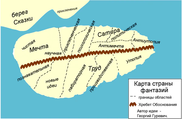 Впоследствии Гуревич разработал новый вариант карты фантазии и выделил на ней следующие жанры фантастики: познавательную, приключенческую, мечту о цели, новые идеи, мечта о средствах (производственный и лабораторный), техника будущего, психологическая, сатирическая, антиутопия и утопия[57].