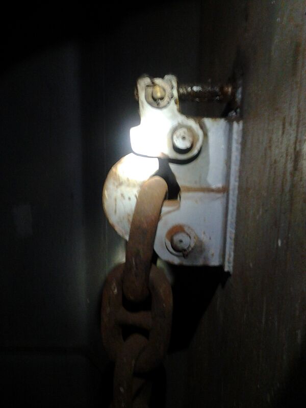 Один его конец с помощью специальной концевой скобы крепится к обуху цепного ящика; второй конец с помощью концевого звена и глаголь-гака присоединяется к коренной смычке якорной цепи.