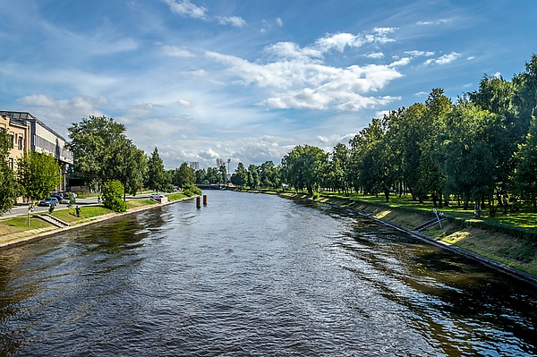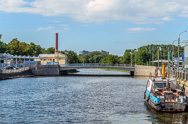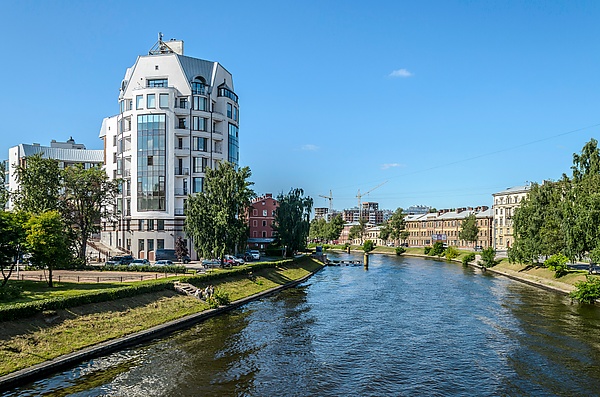 В нижнем течении по берегам когда-то находились предприятия — ОАО завод «Вулкан», ЗАО Пивоваренный завод «Бавария» и другие. Все производства ликвидированы. Левый берег оборудован деревянным свайным креплением, которое к настоящему времени местами пришло в негодность или почти полностью разрушено. Береговой склон зарос древесной и кустарниковой растительностью. Правый берег также порос древесной и кустарниковой растительностью. Бечевник покрыт отмосткой из крупных валунов, гальки, гравия и строительного мусора. Здесь располагаются многочисленные пирсы и причалы.