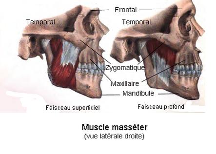 Жевательная мышца (лат. musculus masseter) начинается от нижнего края скуловой дуги двумя частями — поверхностной и глубокой[1].