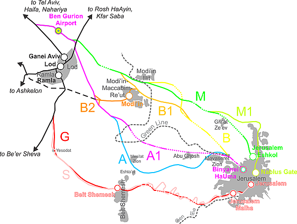 - Планы B, B1, B2, M и M1 – строительство новой линии из Тель-Авива в Иерусалим через Модиин-Маккабим-Реут в пределах или вблизи шоссе 443 .