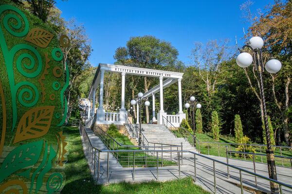 От бювета Смирновского источника в сторону декоративного озера спускается знаменитая каскадная лестница. Верхняя часть её была построена по проекту архитектора Н. А. Папкова в 1936 году[100] и явилась частичной реализацией разработанной архитектурной концепции, заканчиваясь тупиком[101]. В то время по ней струилась минеральная вода, которая частично сбрасывалась из источников. Украшают её фонтаны со скульптурами сказочных персонажей — Хозяйки Медной горы, Данилы-мастера, Нимфы, Царевны-лягушки.