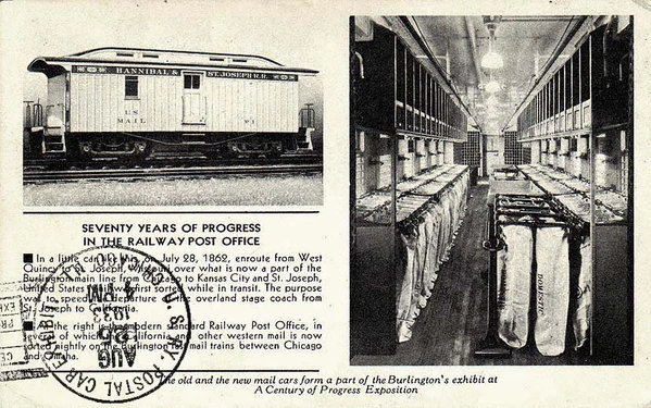 Железнодорожная почта была введена в США 28 июля 1862 года с использованием переоборудованных багажных вагонов на Hannibal and St. Joseph Railroad (которая также доставила первое письмо для Pony Express). Специально построенные вагоны железнодорожной почты поступили на эту линию через несколько недель после начала службы. Сотрудники использовали их для сортировки почты для передачи на дилижанс, отправлявшийся на запад вскоре после прибытия поезда в Сент-Джозеф. Эта служба просуществовала примерно один год[4].