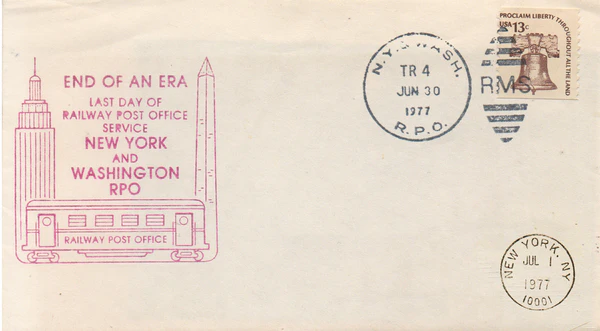 После 113 лет работы железнодорожной почты последний маршрут между Нью-Йорком и Вашингтоном, округ Колумбия был закрыт 30 июня 1977 года. Последний маршрут с названием железнодорожной почты был фактически водным и просуществовал ещё год. Этот водный маршрут железнодорожной почты проходил по озеру Виннипесоки между The Weirs, Нью-Гэмпшир и Bear Island. Последний раз почтовый штемпель на этом маршруте был поставлен 30 сентября 1978 года.