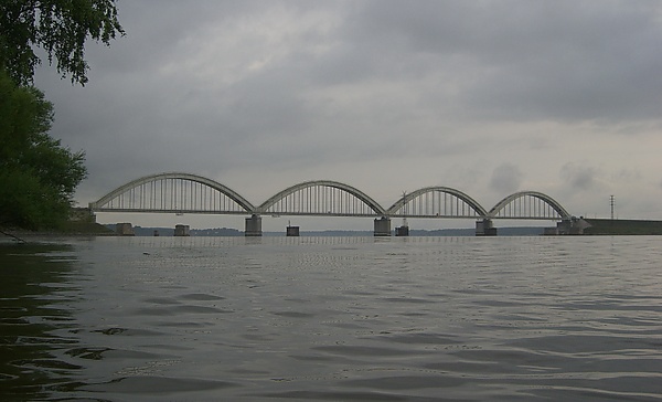 Четырёхпролётный мост с железобетонными арками (каждая весом 4250 т, объёмом 1700 м³). Длина пролётов 124 м. Второй и третий пролёты, считая от правого берега — судоходные (во второй для судов идущих вниз, в третий — вверх). Высота 15,5 м от нормального подпорного уровня.