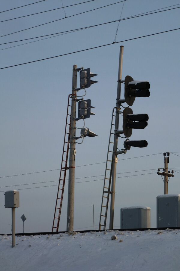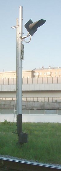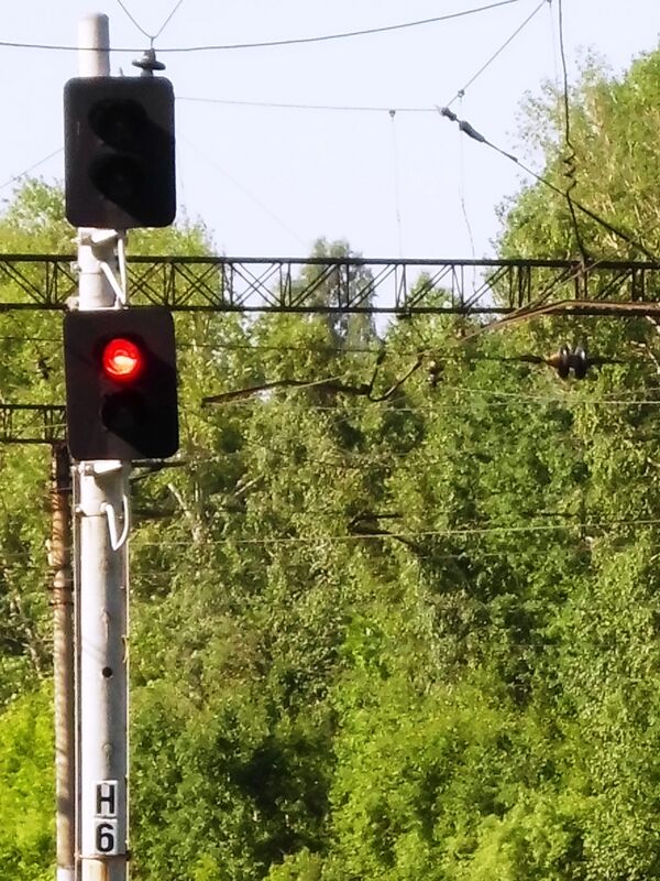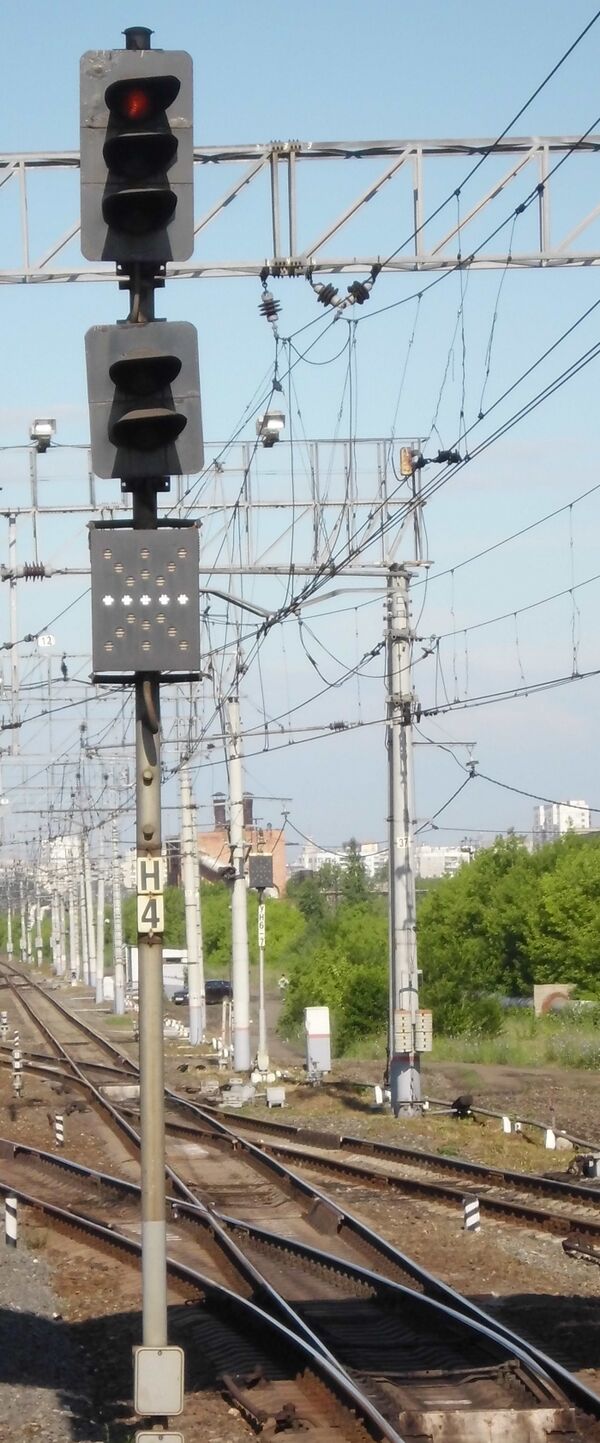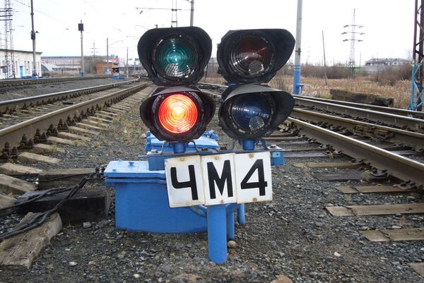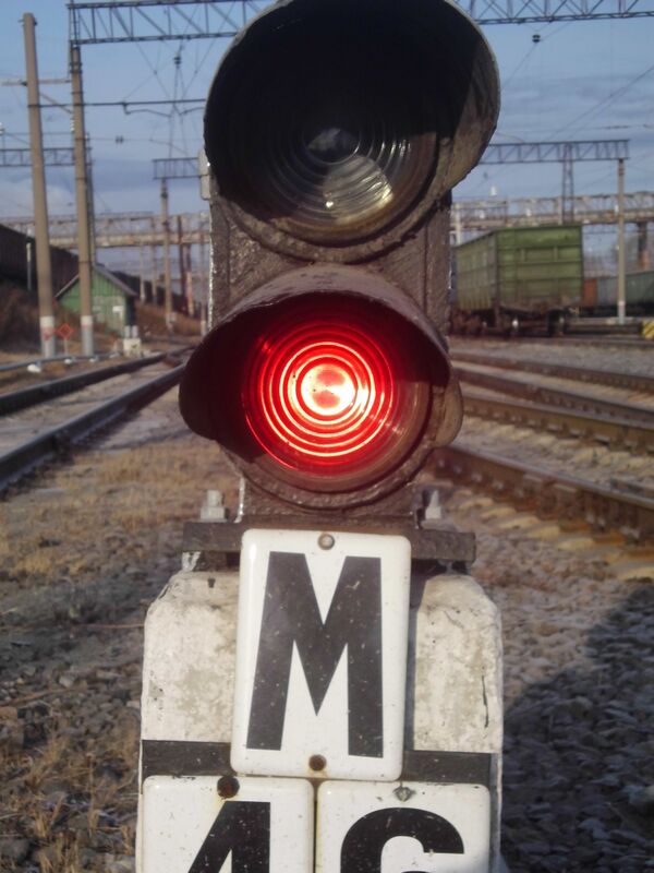 - Жёлтый мигающий — разрешается движение с установленной скоростью, следующий светофор открыт и сигнализирует об отклонении по стрелочному переводу (но требует проследования с уменьшенной скоростью).
