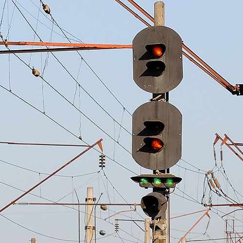 - Два жёлтых огня — «Разрешается проследование светофора с уменьшенной скоростью и готовностью остановиться на станции; поезд следует на боковой путь; следующий светофор закрыт».