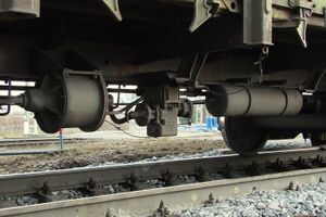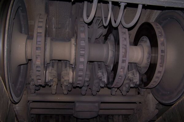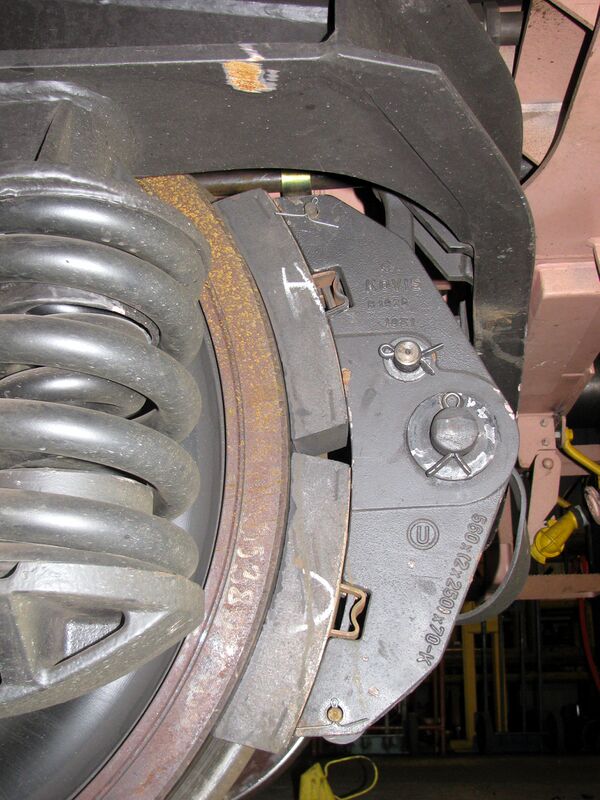 - Фрикционный тормоз, осуществляющий торможение путём прижатия тормозных колодок к рабочей поверхности тормозного диска, размещённого на оси колёсной пары.[5] Рабочий (исполнительный) элемент автоматических пневматических тормозов. Обычно применяется на пассажирских вагонах и моторвагонном подвижном составе.