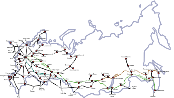 Самая длинная дорога в мире (2018) Транссибирская магистраль начала строиться в 1891 году одновременно от Челябинска через Новониколаевск на Красноярск и Иркутск и от Владивостока на Хабаровск. Полностью по территории Российской империи движение было открыто после ввода в строй моста через реку Амур в 1916 году[32]. Ещё одна стратегическая дорога — КВЖД — была построена на территории соседнего Китая.