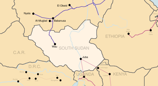 Железнодорожный транспорт в Южном Судане развит слабо. 248 километров существующих в стране железных дорог представляют собой южносуданскую часть узкоколейной (ширина колеи — 1067 мм) однопутной ж/д линии, соединяющей город Вау с городом Бабануса в Судане. Эта линия была построена в 1959—1962 гг, сильно повреждена во время гражданской войны, а позже отремонтирована при помощи ООН.[1]