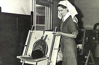 В разгар эпидемии полиомиелита в 1940-x и 1950-х годах, врачи заполняли больничные палаты целыми рядами «Железных лёгких» для пациентов с бульбарной и бульбо-спинальной формами полиомиелита. Среди пациентов были как дети, так и взрослые. Больные полиомиелитом с парализованной диафрагмой обычно проводили около двух недель на восстановлении в «Железных лёгких»[36][37].