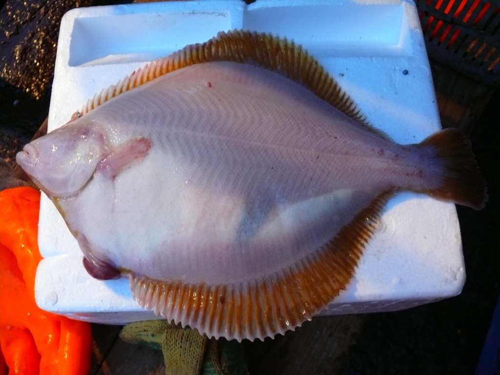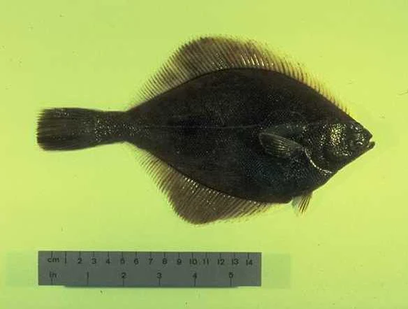 Слева на право: Желтопёрая камбала северных Курильских островов. Слепая и глазная стороны. Продольный шлиф отолита желтопёрой камбалы, возрастом 19 лет