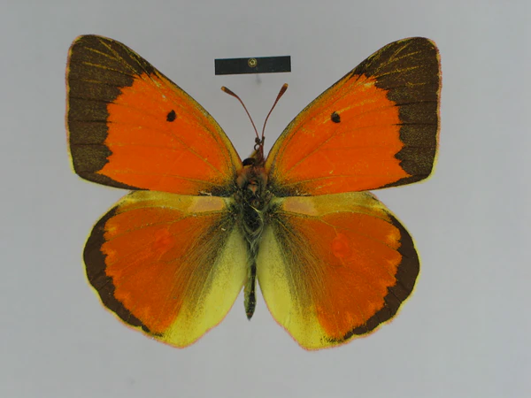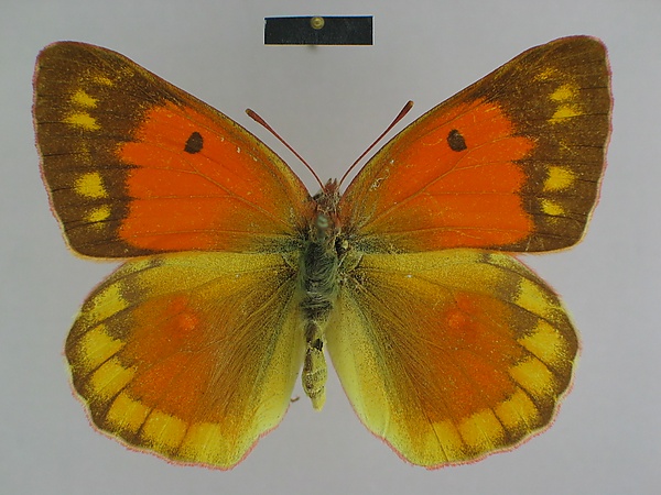 - Самец. Длина переднего крыла 25 — 30 мм. Верхняя сторона крыльев ярко-оранжевая. Переднее крыло несёт на себе широкую чёрную кайму, не пересеченной светлыми жилками (у некоторых экземпляров светлые жилки имеются в привершинной области крыла), и округлое чёрное дискальное пятно. Чёрная кайма часто бывает опылена светлыми чешуйками. Оранжевая фоновая часть крыла иногда с фиолетовым отливом. Заднее крыло с более или менее заметным тёмным опылением на всей оранжевой поверхности, за исключением ярко-оранжевого двойного дискального пятна и сплошной, не пересеченной светлыми жилками, краевой каймой. Андрокониальные поля находятся в базальном углу ячейки Sс + R1 — Rs розово-желтые, матовые. Нижняя сторона крыльев ярко-желтая, переднее с чёрным дискальным пятном и мелкими постдискальными пятнами, образующими неполный ряд, идущий параллельный внешнему краю. Центральная область крыла на нижней стороне крыльев ярко-оранжевые. Заднее крыло с серебристым двойным дискальным пятном, каждая часть которого с собственной концентрической ржаво-коричневой оторочкой, и рядом ржаво-коричневых пятен постдискального ряда. По внешнему краю проходит тонкая розовая линия. Бахрома крыльев сверху розовато-желтая, снизу — розовая[3].