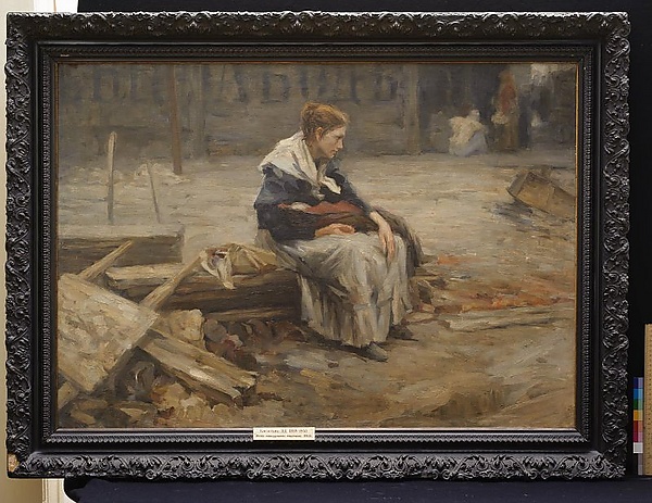На картине изображена сцена на территории завода: молодая женщина с ребёнком, завернутым в красно-коричневое одеяло, сидит на досках. Женщина одета в серую длинную юбку, чёрную кофту и белый платок, завязанный на груди. Рядом с ней на досках лежит узелок. На переднем плане у груды щебня и досок виден фрагмент носилок. Фон выполнен в тёмных тонах, на заборе заметна неразборчивая надпись большими чёрными буквами. Справа на заднем плане, у заводских ворот, находятся женские фигуры в светлой одежде. Композиция отражает характерные мотивы бытового жанра, акцентируя внимание на повседневной жизни и социальной среде.