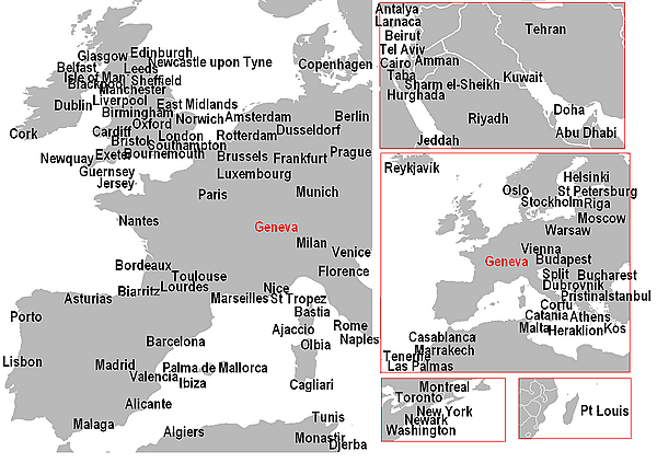 | EasyJet Switzerland | Аяччо (сезонный), Аликанте, Амстердам, Астурия, Барселона, Бастия, Берлин (Шёнефельд), Бирмингем (сезонный), Бордо, Борнмут (сезонный), Бриндизи (с 4 апреля 2010), Бристоль, Брюссель, Будапешт, Кальяри (сезонный), Копенгаген, Дубровник, Фару (с 3 апреля 2010), Ираклион (Никос Казанцакис) - с 19 июня 2010, Ибиса (сезонный), Лас-Пальмас, Лиссабон, Лондон (Гатвик), Мадрид, Малага, Марракеш, Нант, Неаполь (сезонный), Ницца, Олбия (сезонный), Пальма-де-Мальорка, Париж (Орли), Порту, Приштина (с 19 июня 2010), Рим (Фьюмичино), Шарм-эш-Шейх, Сплит (сезонный), Стокгольм (Арланда), Тель-Авив (с 30 августа 2010), Тулуза |