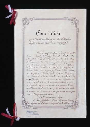 - Первая Женевская конвенция «Об улучшении участи раненых и больных в действующих армиях» (впервые принята в 1864[16], пересмотрена в 1906[17], 1929[18] и окончательно в 1949)[19];