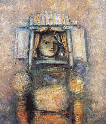 На полотне представлено поясное изображение молодой женщины. Особенность композиции заключается в сложной конструкции на её голове, напоминающей окно с занавесками и раскрытыми ставнями, из которого выглядывает лицо.