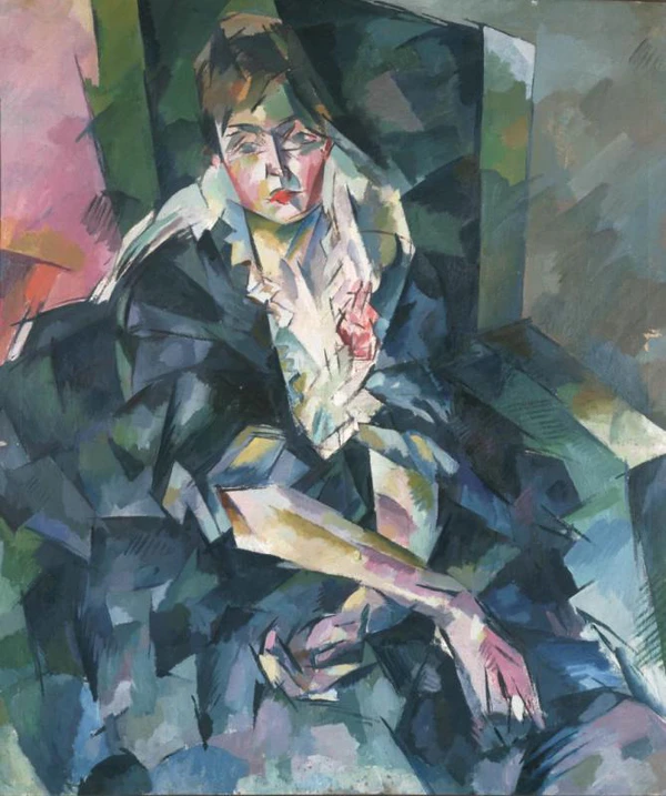 Полотно представляет собой портрет женщины, выполненный в манере, близкой к кубизму. Композиция построена из разноразмерных геометрических фрагментов, формирующих образ сидящей в кресле фигуры в поколенном ракурсе три четверти вправо. Женщина изображена с головой в фас, склонённой к правому плечу, волосы собраны в высокую причёску. Она одета в платье зелёных оттенков с рукавом до локтя, глубоким декольте и крупными рюшами по краю. Фон картины разделён на две части: справа преобладают голубовато-коричневые оттенки, слева — сиреневато-розовый с жёлтым и оранжевым пятном внизу, что придаёт работе сложную цветовую гамму.