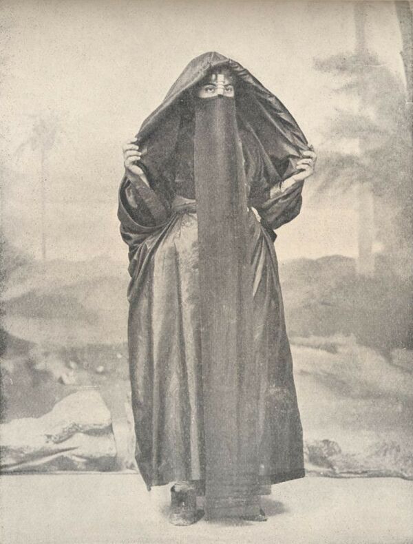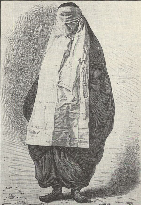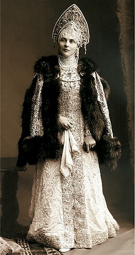 Женская одежда, по своему покрою, по возможности приближалась к монашеской. Талия вовсе не допускалась; гладкое верхнее платье ни единой складкой не должно было обнаруживать форм стана, хотя и могло отличаться самою вычурной отделкой. Фата из тонкого полотна или батиста, вышитая или усаженная жемчугом, служила покрывалом и дополняла костюм русских женщин.