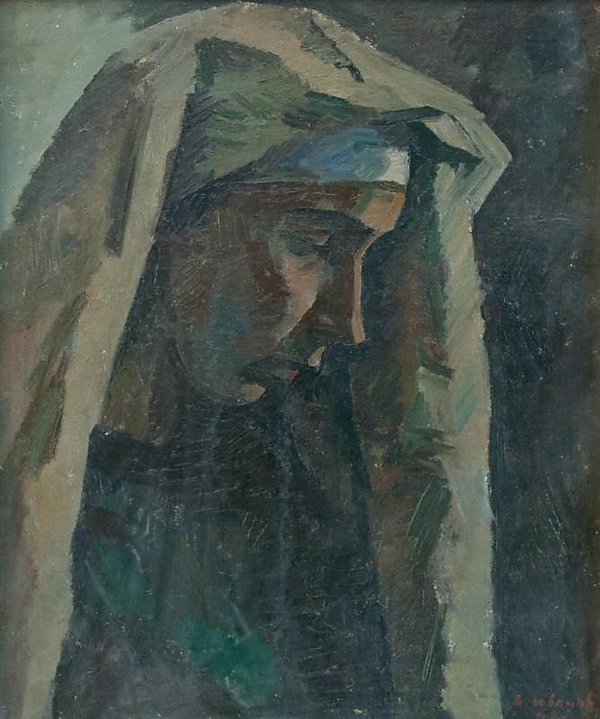 На картине представлен портрет женщины в профиль. Она одета в зелёное платье, голову покрывает светло-серое покрывало.